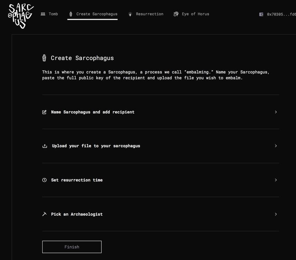 在 Sarcophagus 应用中,交易在以太坊上执行,数据会存储在 Arweave 中。整体的一个运行机制是,创建失能开关的人在 Sarcophagus 里上传文件(文档或图片等形式,最大文件大小为 2.9 MB),并指定私钥接收人和设置复活日期。这里复活指的是,如果创建失能开关的人未能在封存时段内采取行动或再封存(re-wrap),则在该日期之后石棺就会被第三方激励节点运营商解密,接收者可以访问石棺内层,即文件本身。