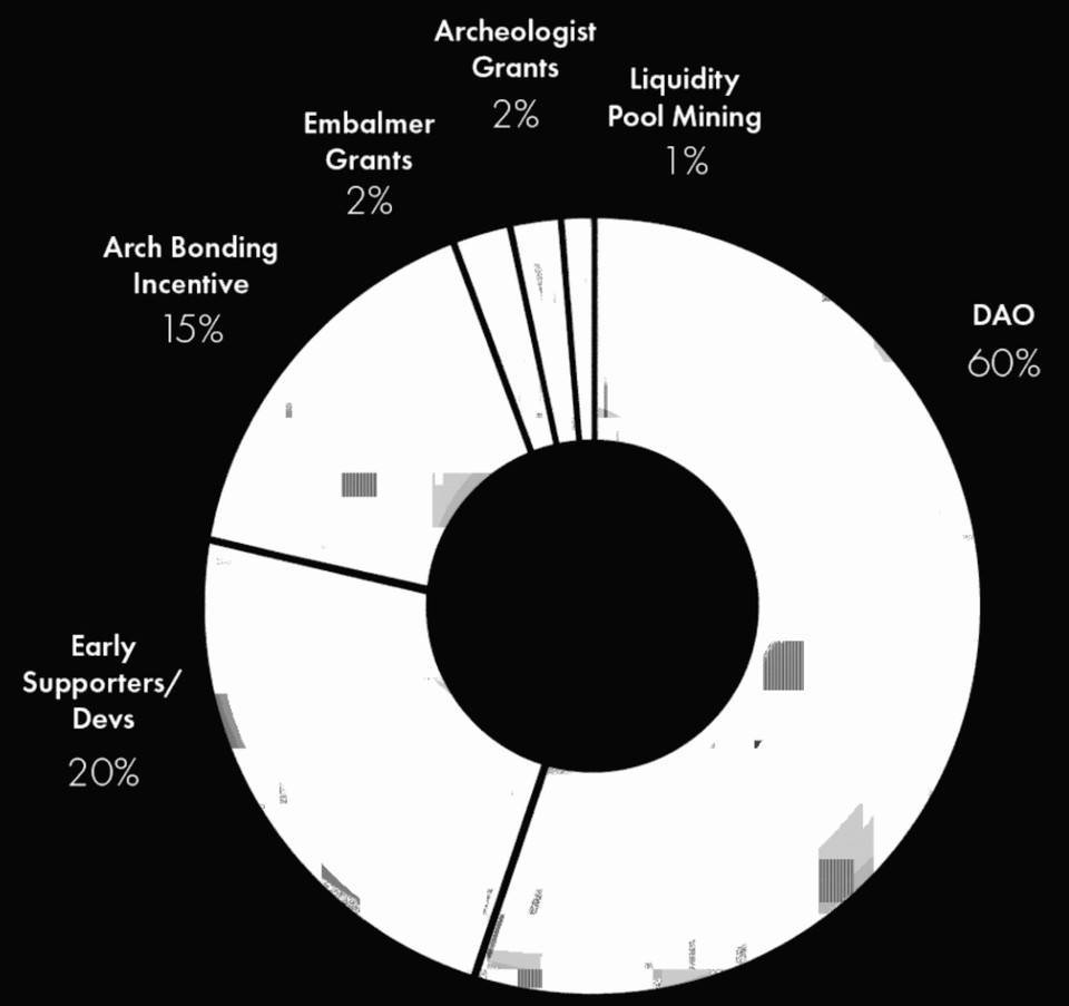 Sarcophagus 代币 SARCO 总量有 1 亿枚,其中,1% 通过公平启动的方式在今年年初开始分配给稳定币流动性提供者,仅支持 USDC、USDT 和 DAI,会在自项目启动之后的一年内分配,到明年 2 月份结束;60% 分配给 DAO,分配给节点运营商和失能开关创建用户各 2%(赠款形式),15% 分配至节点运营商保金激励(Arch Bonding Incentives),20% 分配给早期支持者和开发团队。